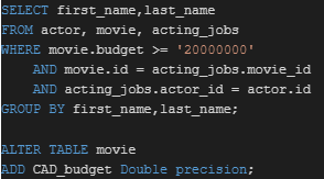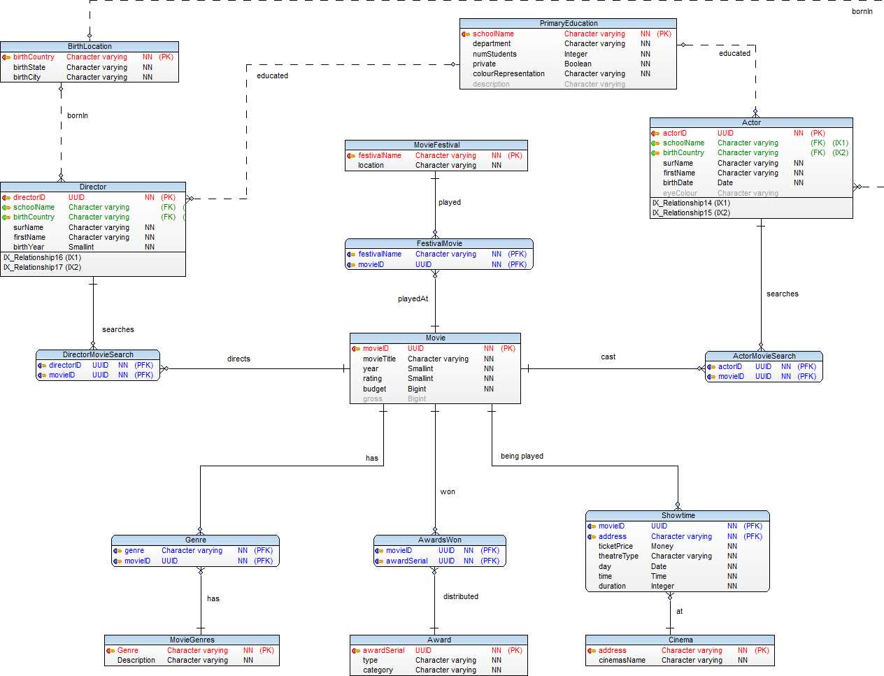 For this SQL project, I was supposed to design a movie database, like IMDb. To begin this project, I used ToadDataModeler to create a visual database. This was helpful so that I could see what information was able to be stored and how tables were connected. After creating this model, it was translated into SQL. I used pgAdmin to run the database. From there I was able to populate the database and then run queries. This project challenged me since it was something new and I had never done before. I was able to really expand my knowledge by learning a new language and learning how to integrate databases in other languages like Java. This is based off of a given assingment. |